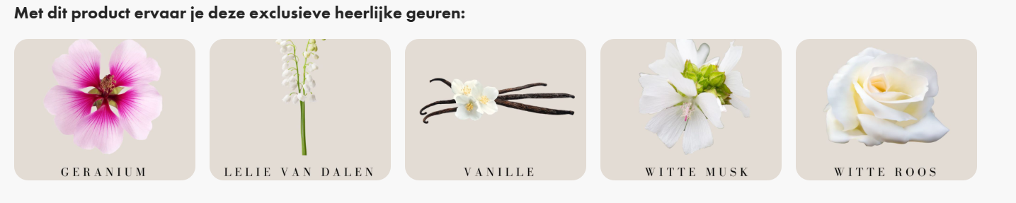 Verfijnde bloemigheid – Frisse noten van lelietje-van-dalen, witte roos en geranium brengen elegantie in je ruimte.