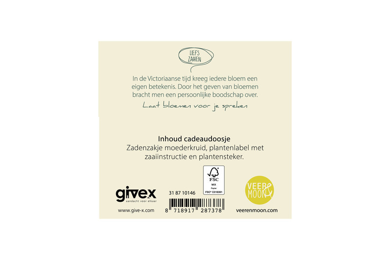 1 zakje met Moederkruid, plantenlabel met zaaiinstructies en plantensteker.